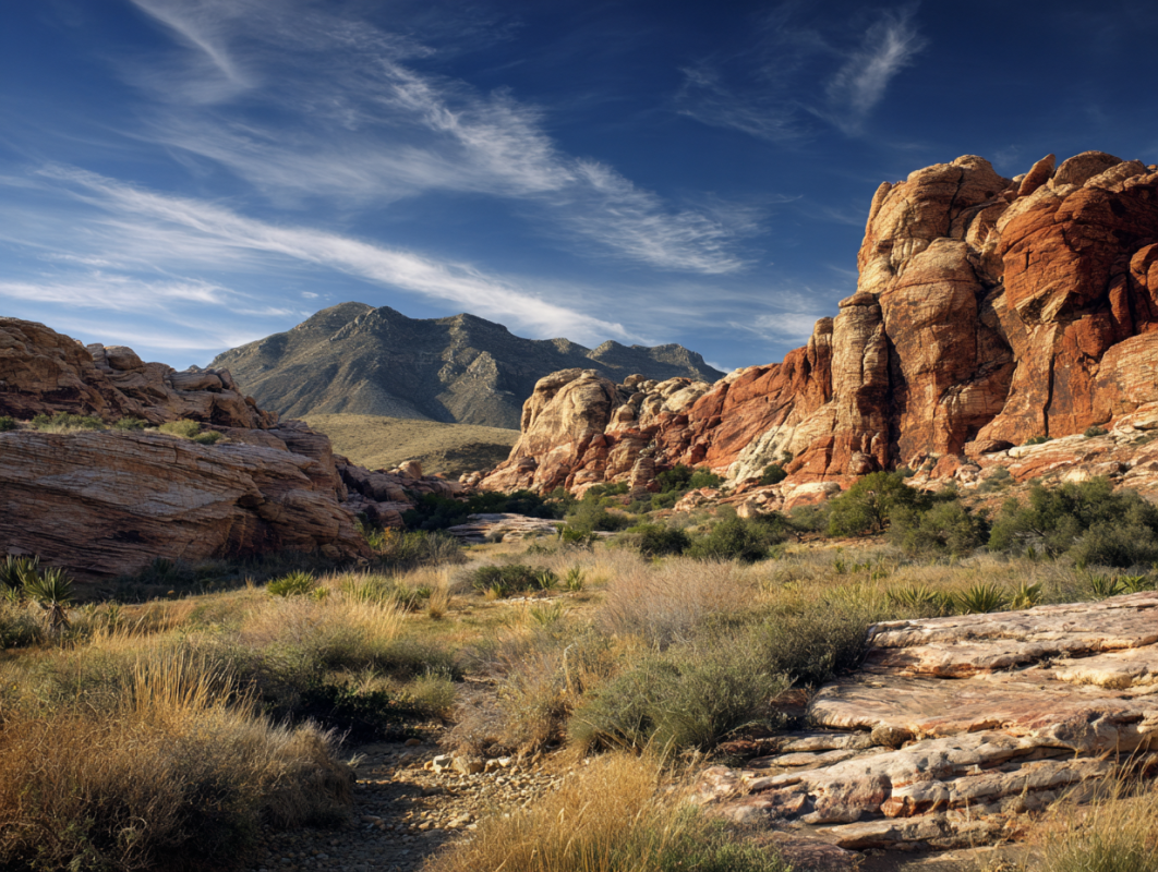 Located just 17 miles west of Las Vegas, Red Rock Canyon offers a stunning backdrop of towering red sandstone formations. There are many trails to explore, ranging from easy strolls to challenging hikes, such as the Calico Tanks Trail and Ice Box Canyon Trail.